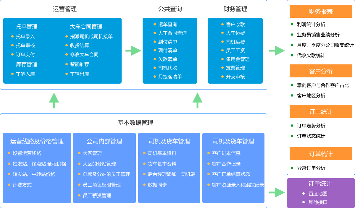 灵活多样的配车调度方式,节约人力物力 实时定位,运输路线全程跟踪,半岛(中国)轨迹回放,一目了然 预警通知,异常填报,突发事件及时知晓,确保安全将货物送达 智能拆分订单,匹配运输路由 接口全兼容,完美对接各类系统订单管理系统开发